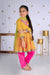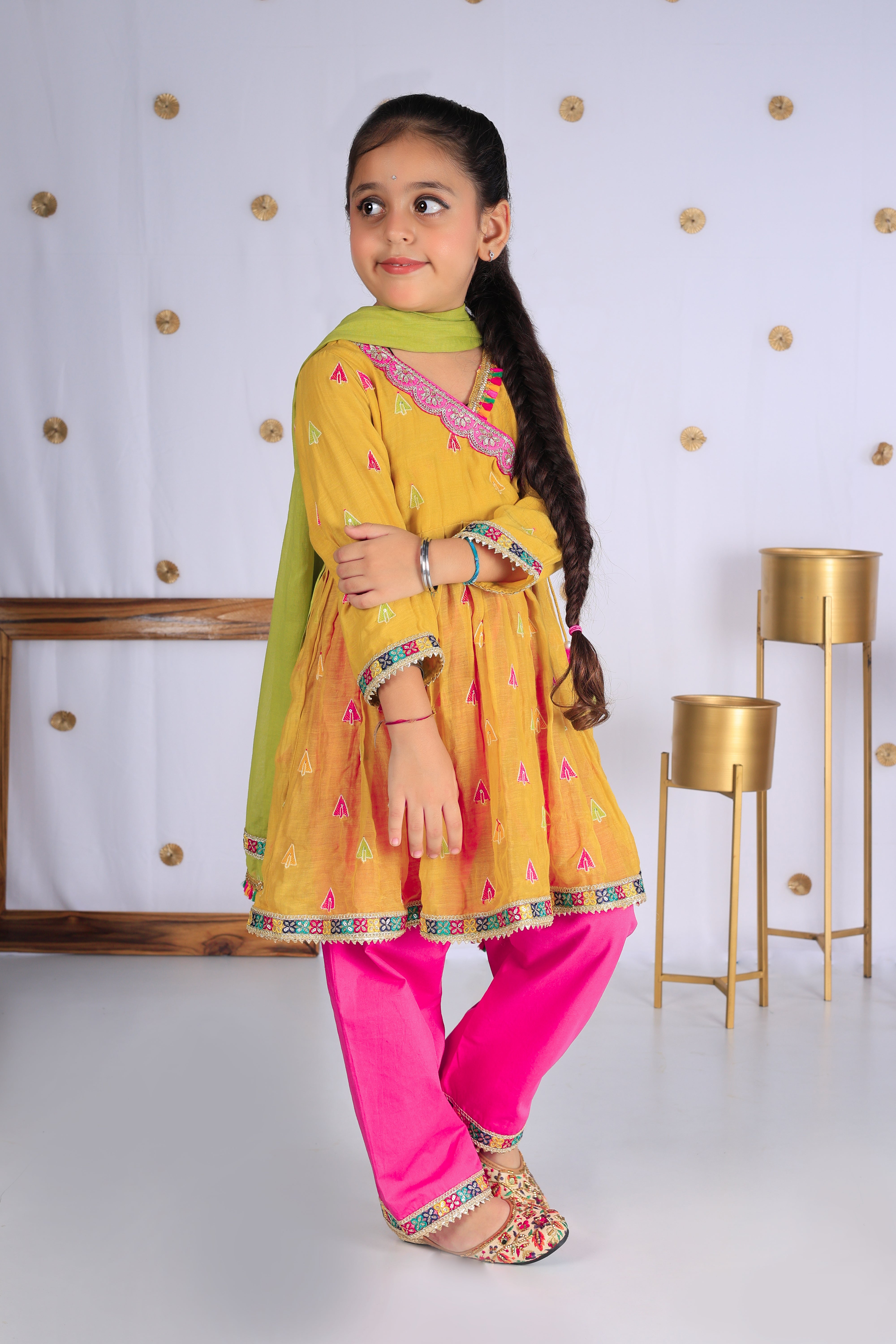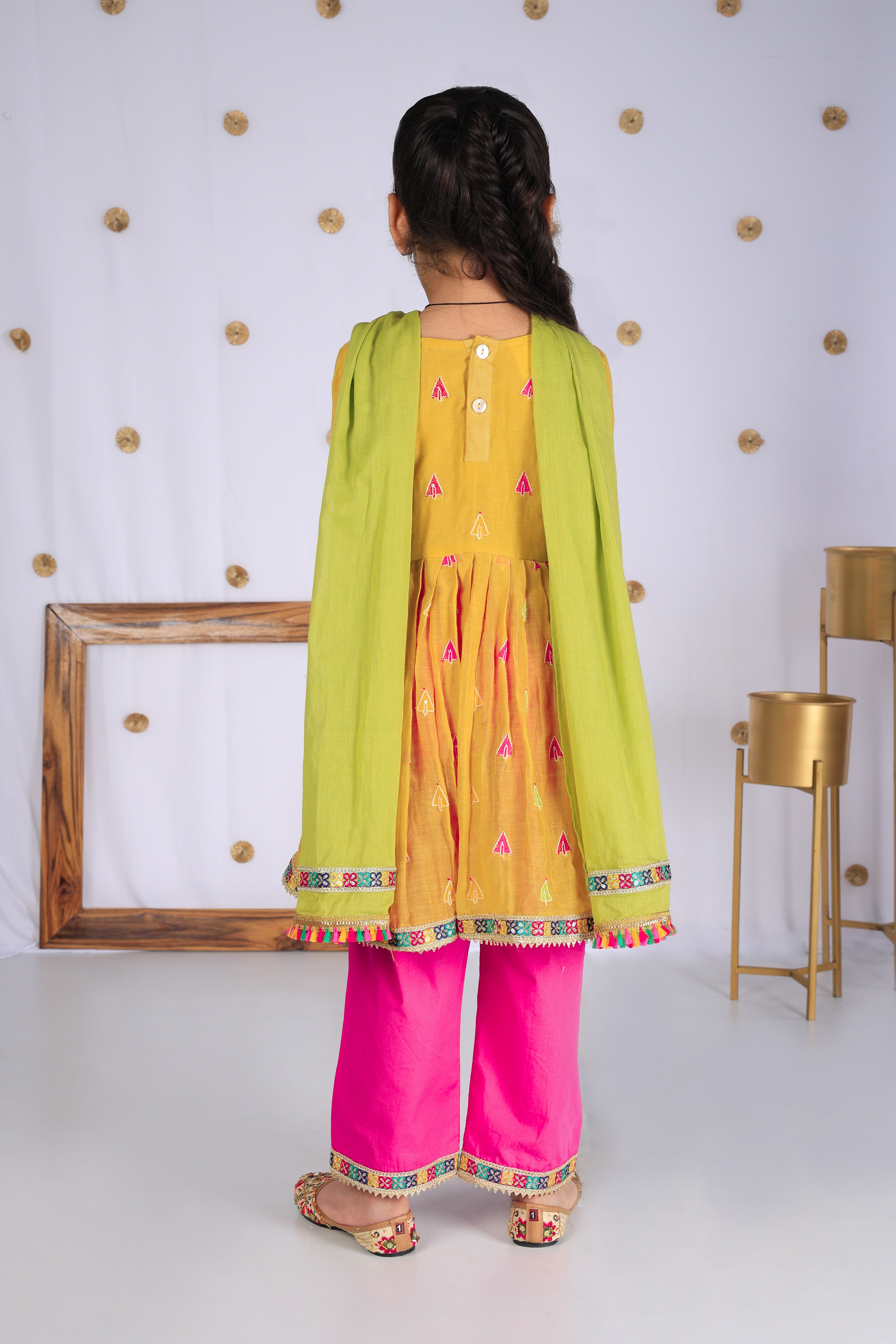 Crafted in soft mul cotton, this mustard kurta is highlighted with colorful embroidered motifs and playful gota trims. Paired with vibrant pink pants and a green dupatta, it’s a cheerful festive outfit that blends tradition with comfort for your little one’s celebrations.