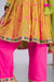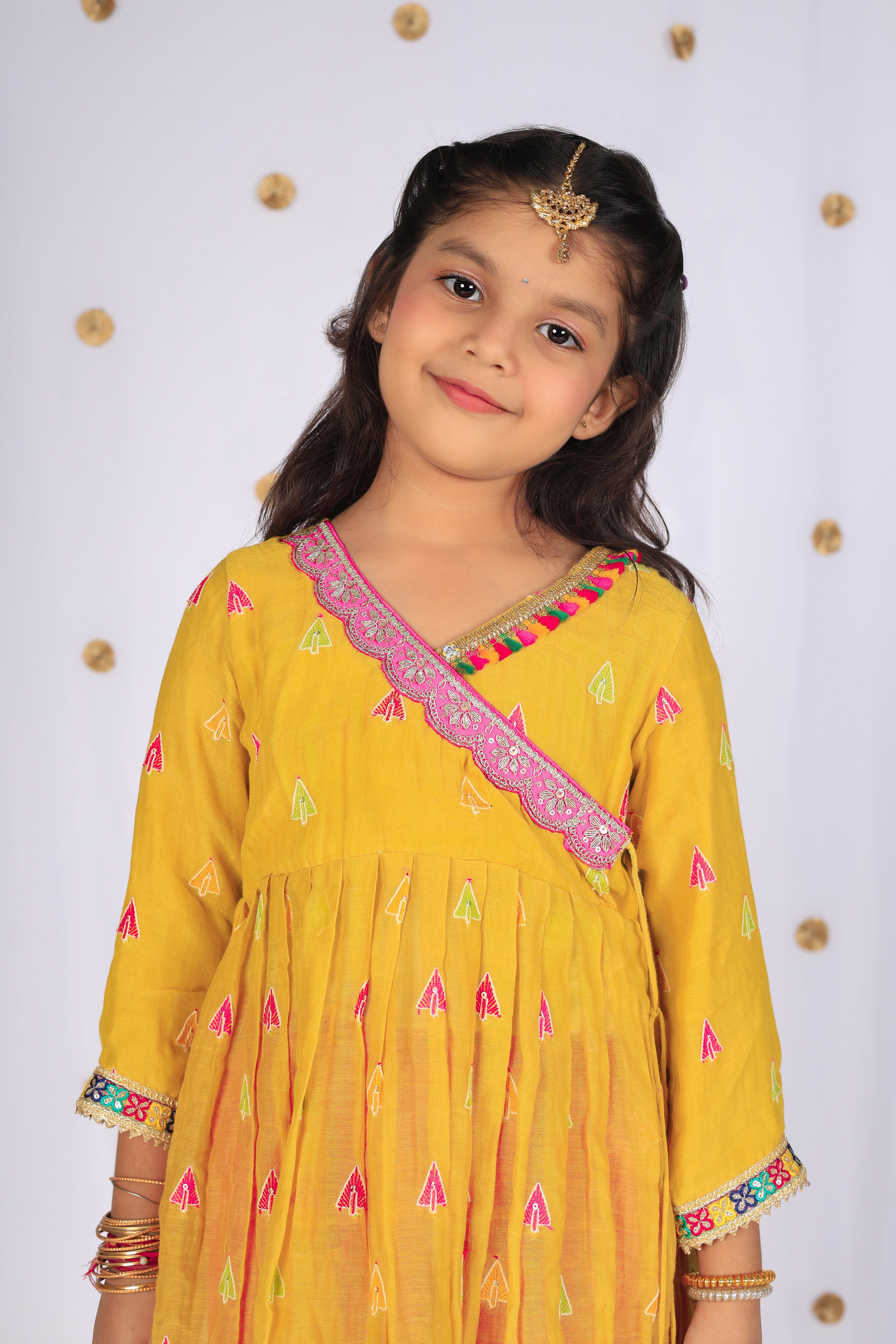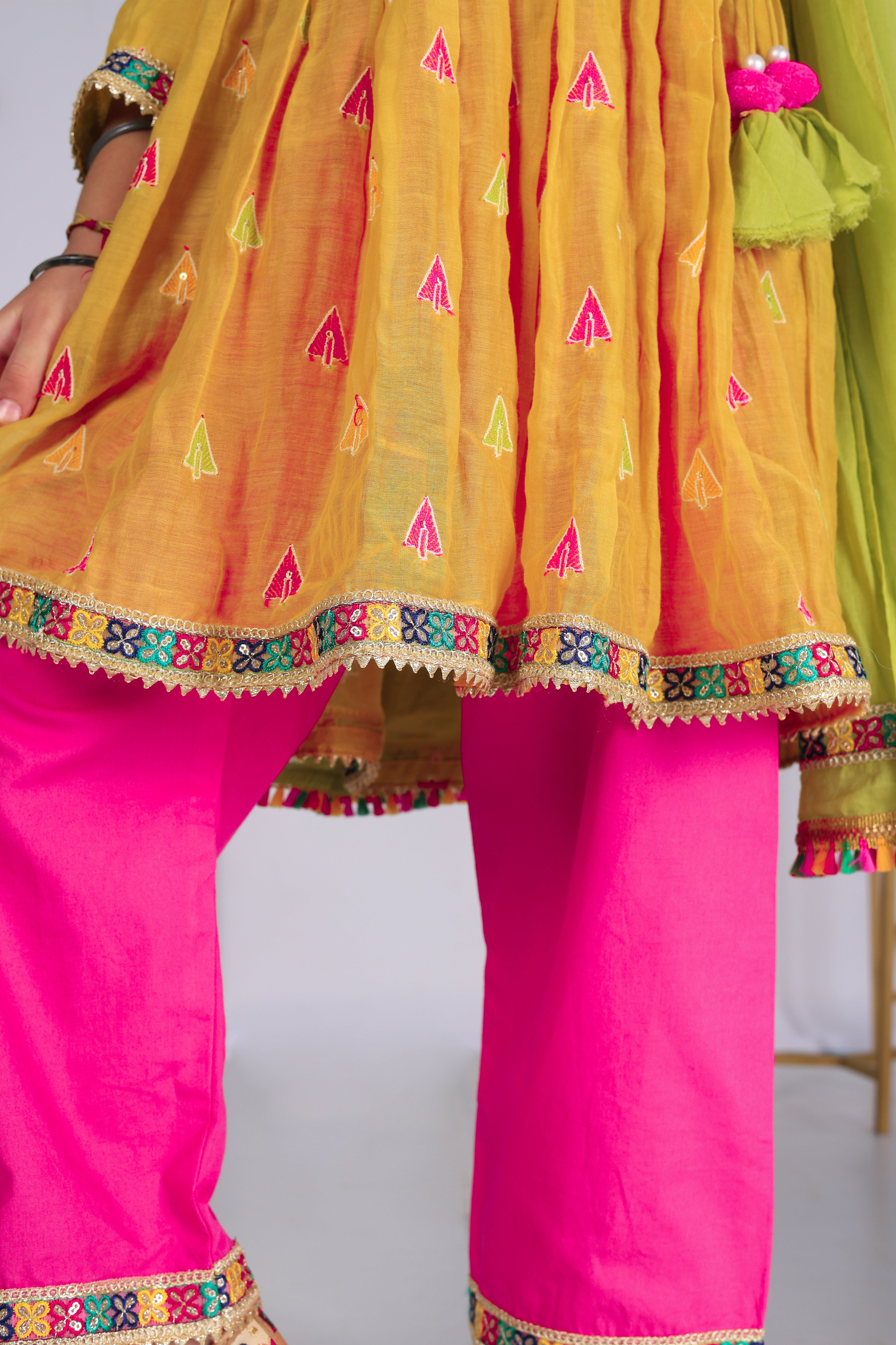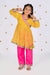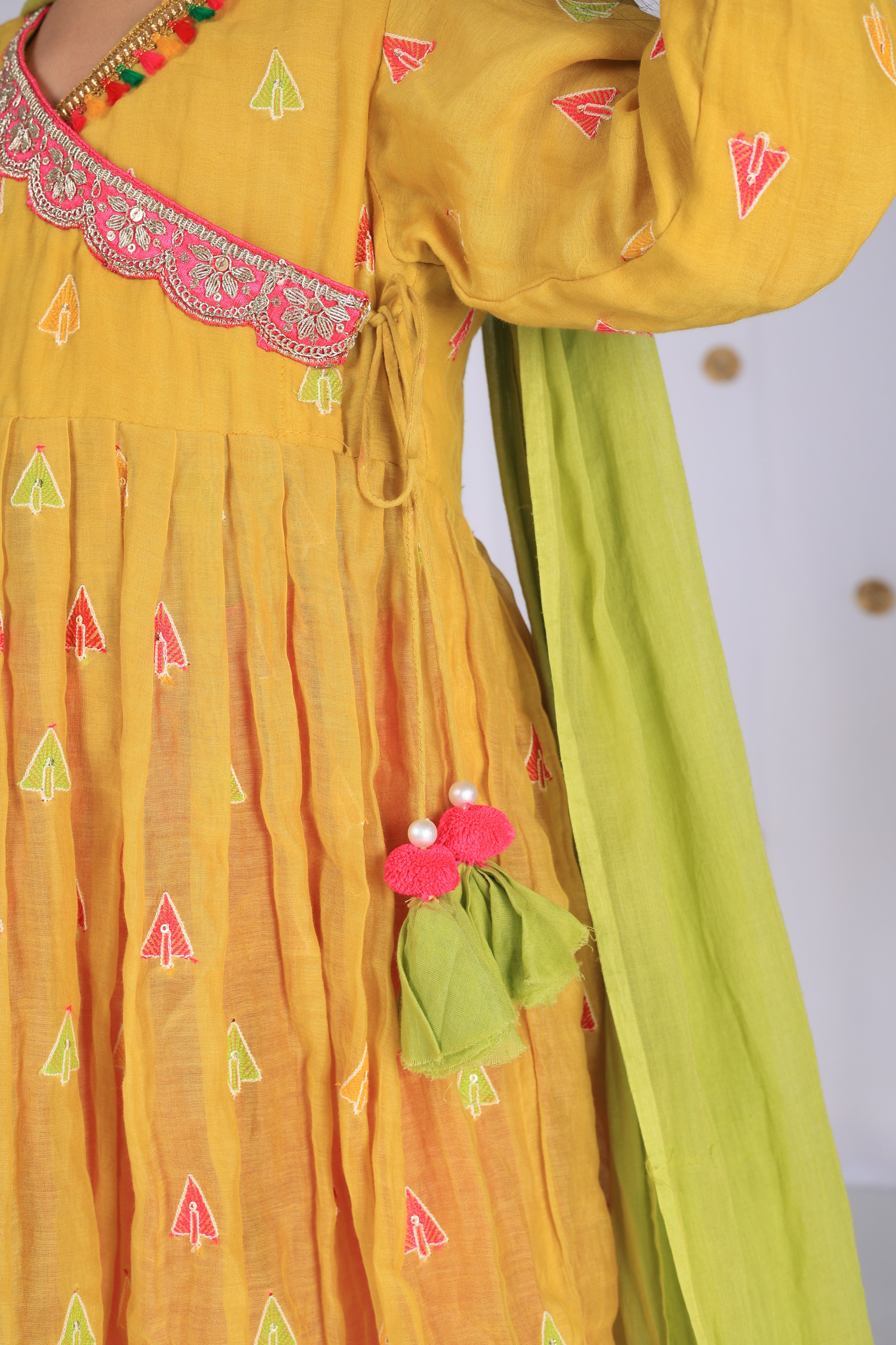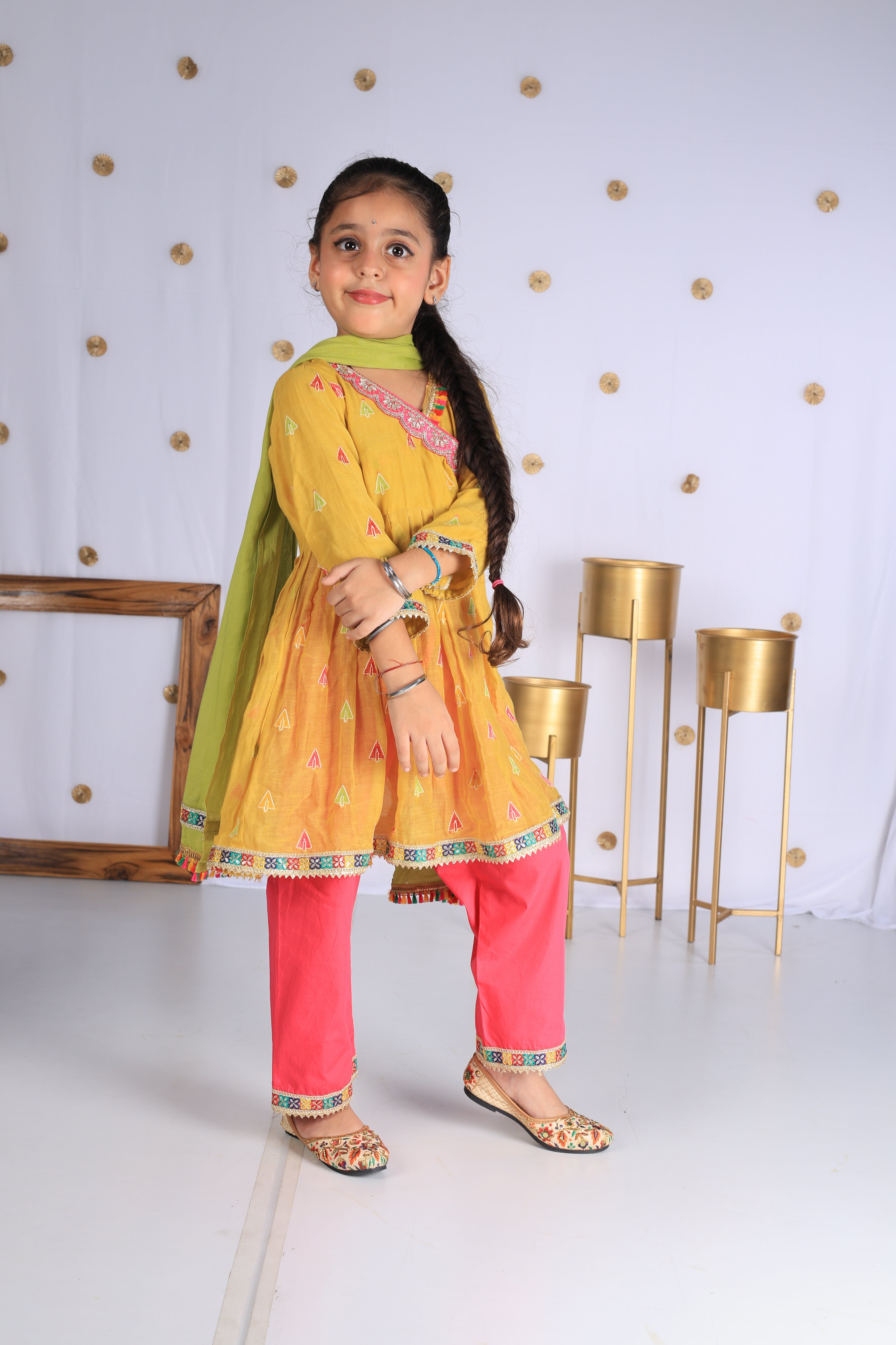 Crafted in soft mul cotton, this mustard kurta is highlighted with colorful embroidered motifs and playful gota trims. Paired with vibrant pink pants and a green dupatta, it’s a cheerful festive outfit that blends tradition with comfort for your little one’s celebrations.
