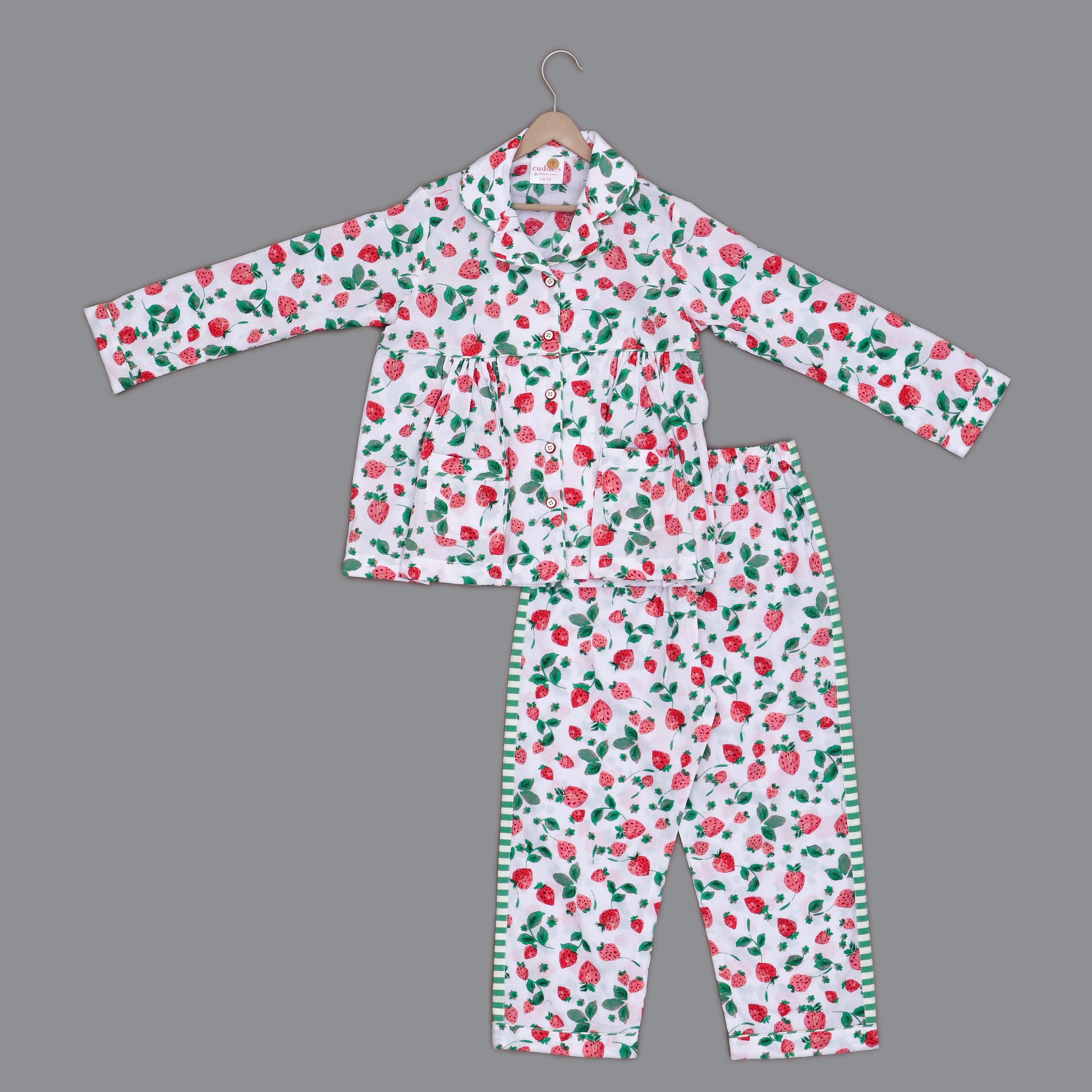 White & Red Strawberry Print Cotton Nightsuit