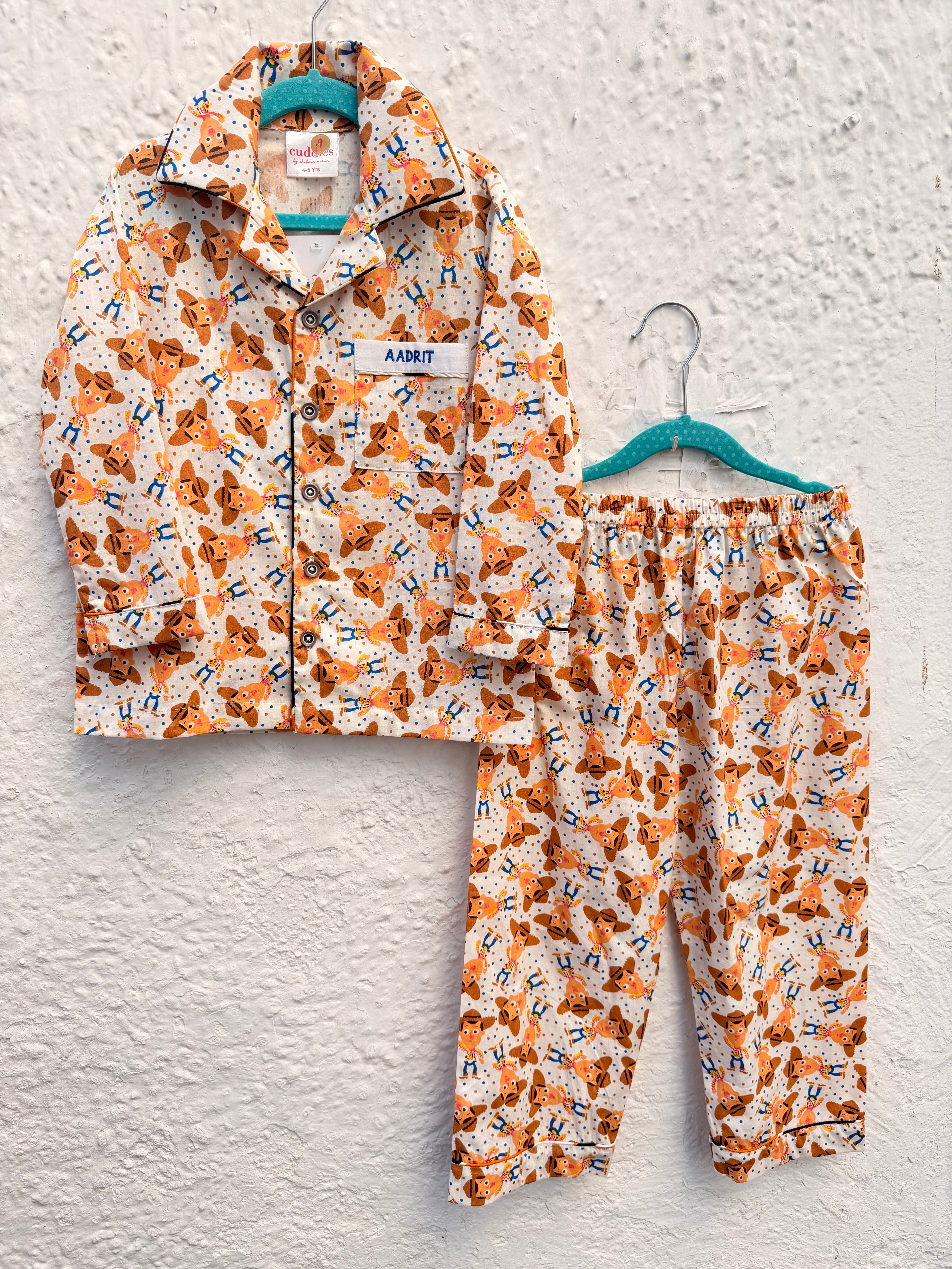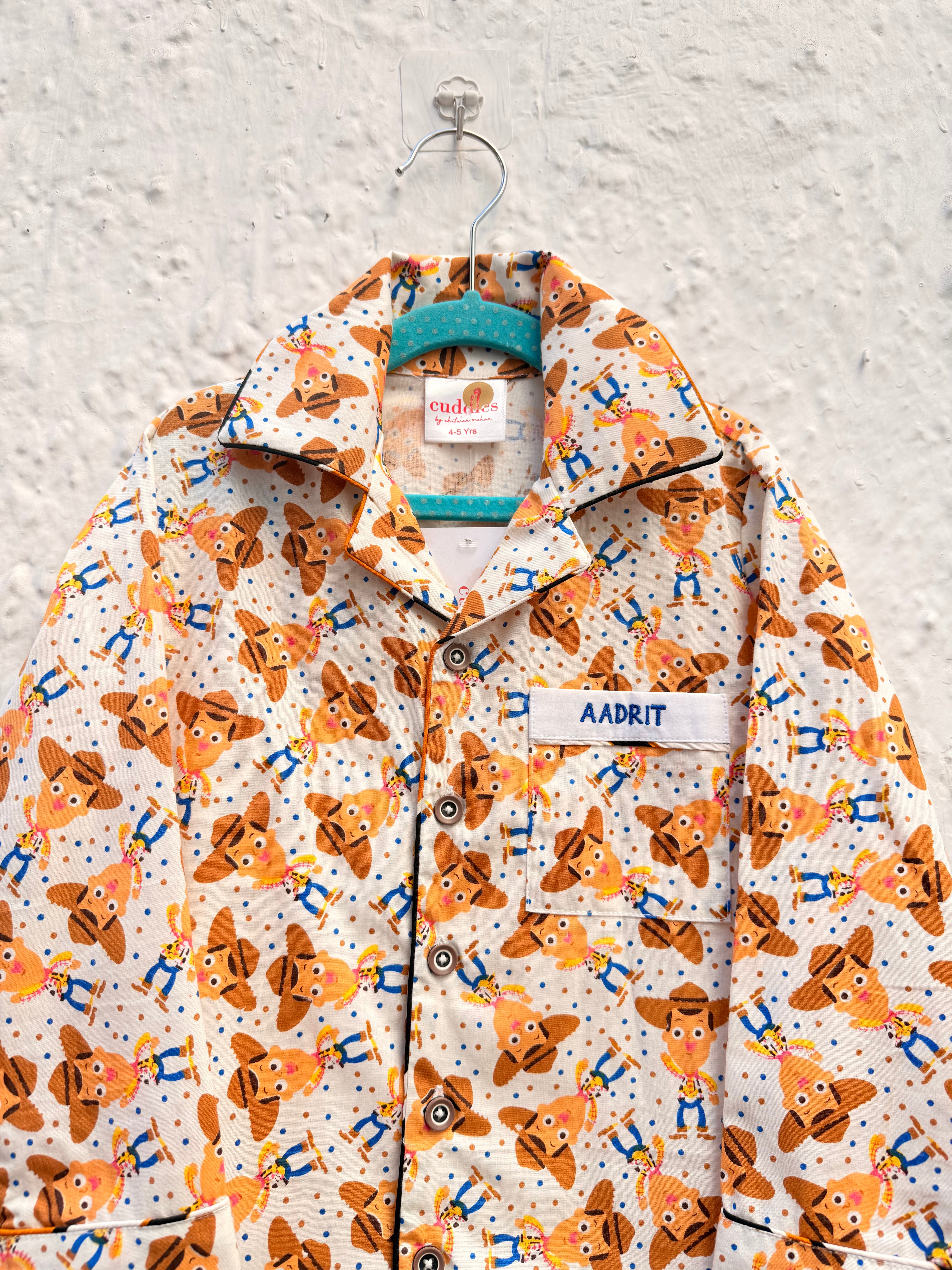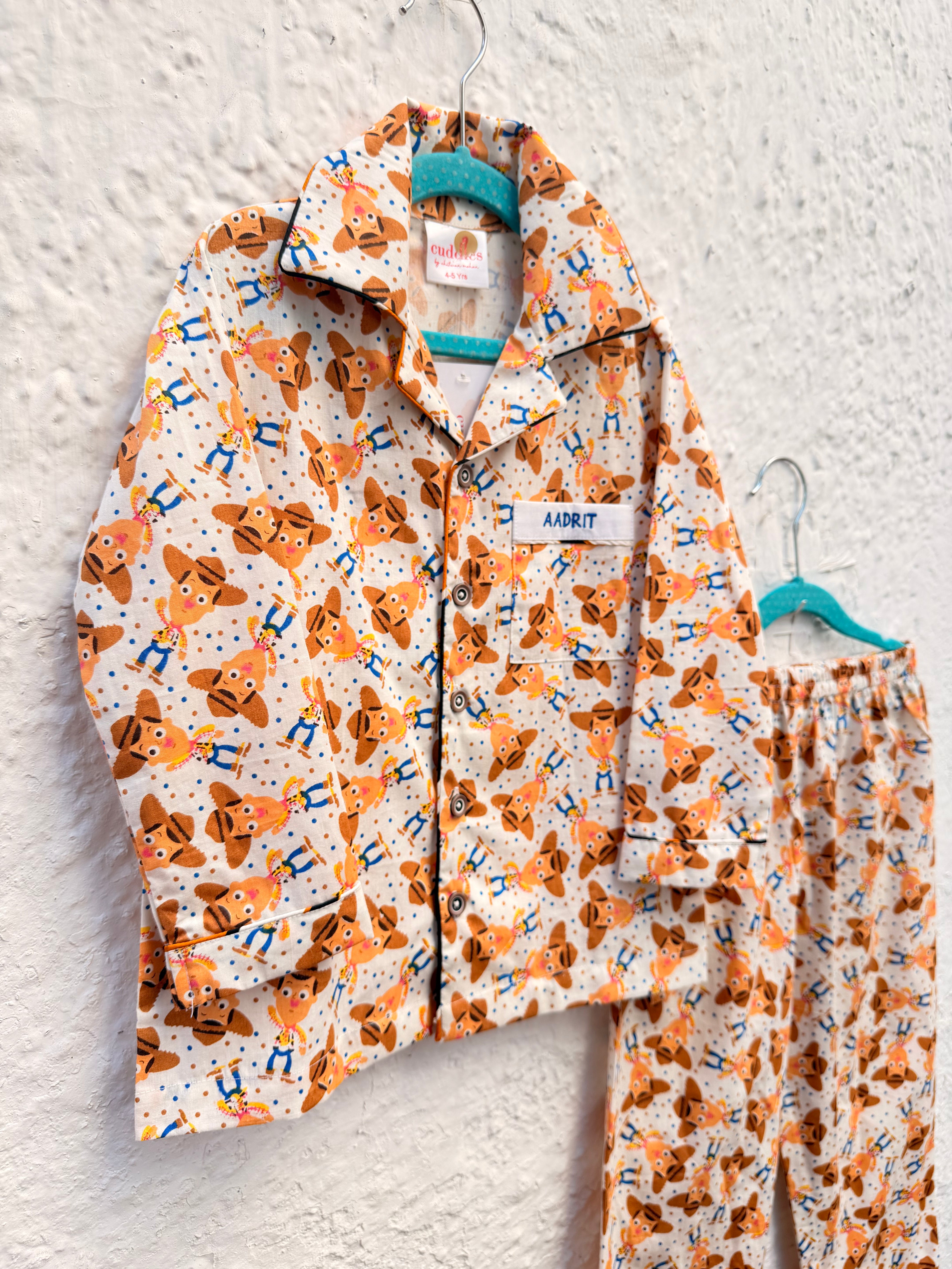 Shop our 2-piece personalized Toy Story pajama set. Features a Woody-themed cowboy print, classic button-down front, and custom name embroidery. Durable, soft cotton blend for maximum comfort.