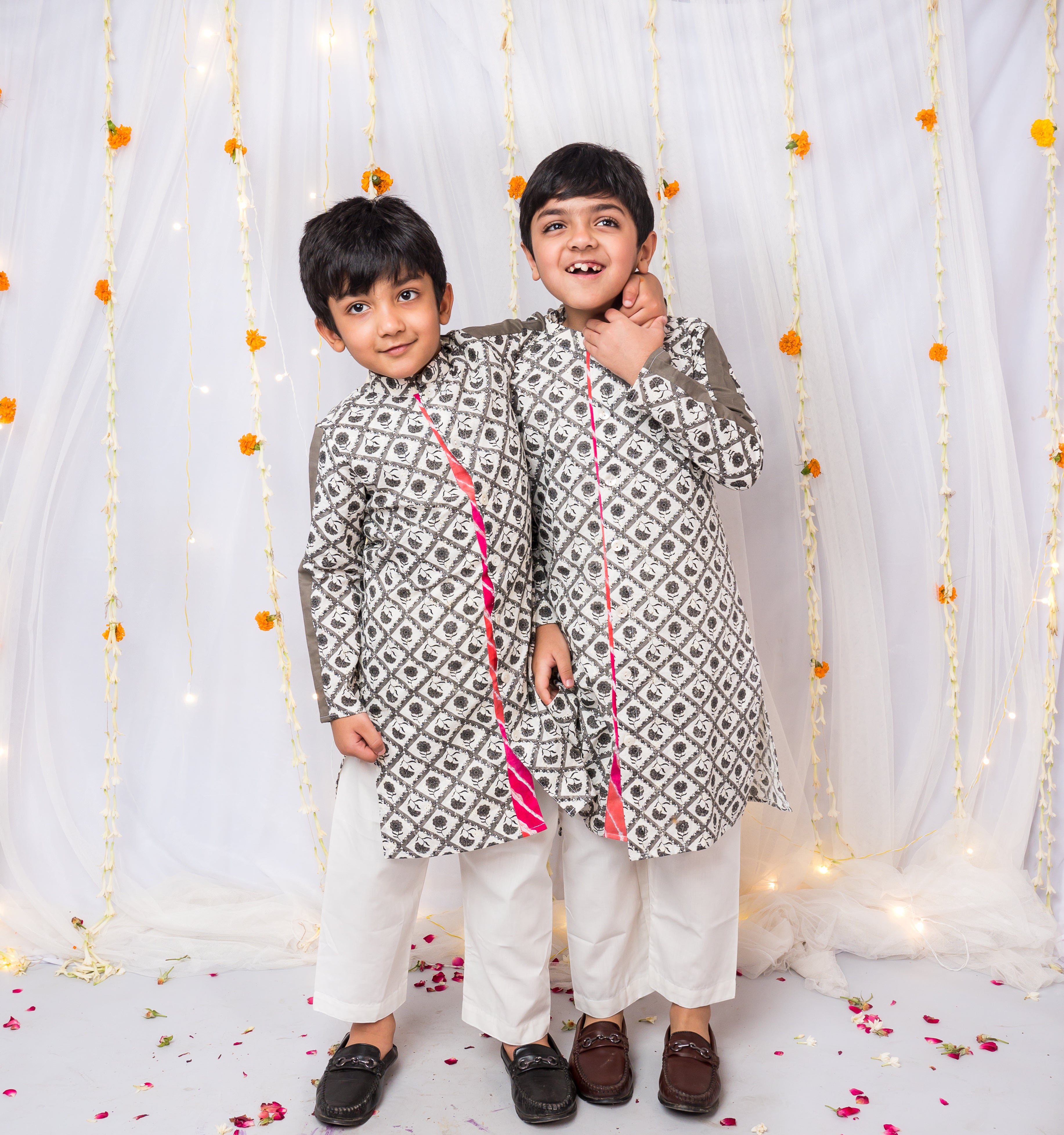 Boys Front-Open Chikankari Kurta with Pink Lehriya Accent